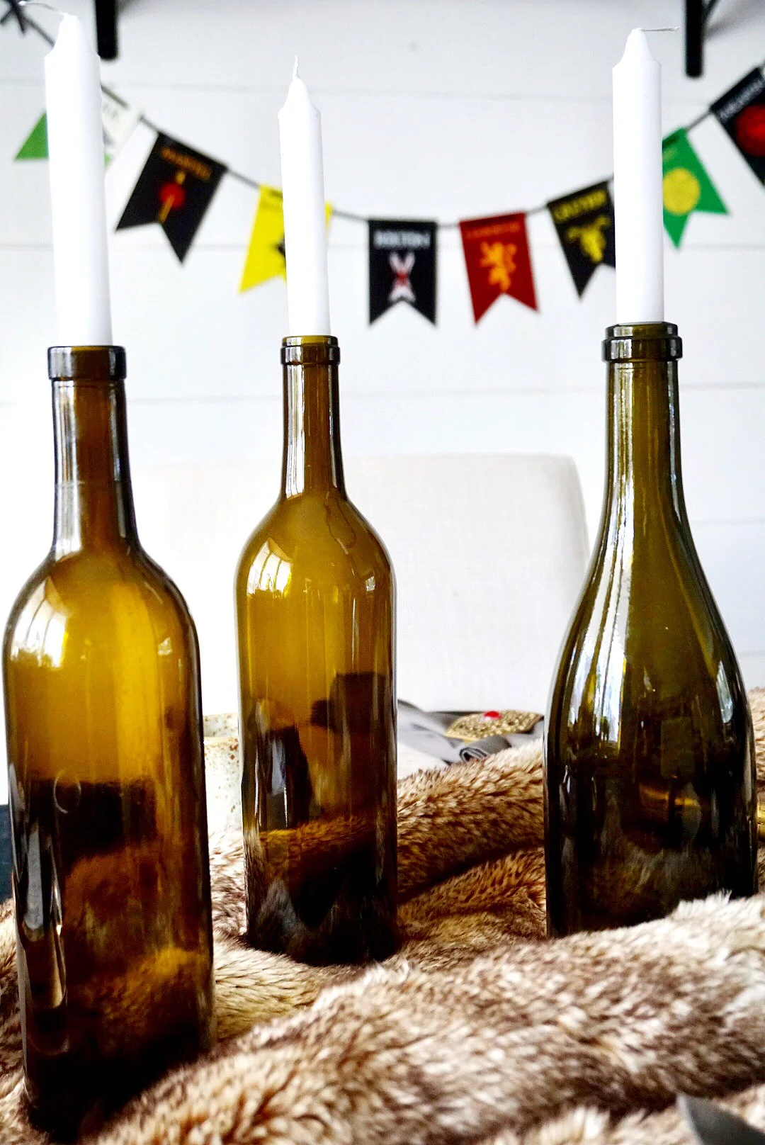 In each bottle, I added a candlestick. You can pick up a pack of 6 shorter candles for $1 at Dollar Tree. I was also going to try and mix in some taller tapered candles, but the smaller sized candles ended up working better in the bottles.